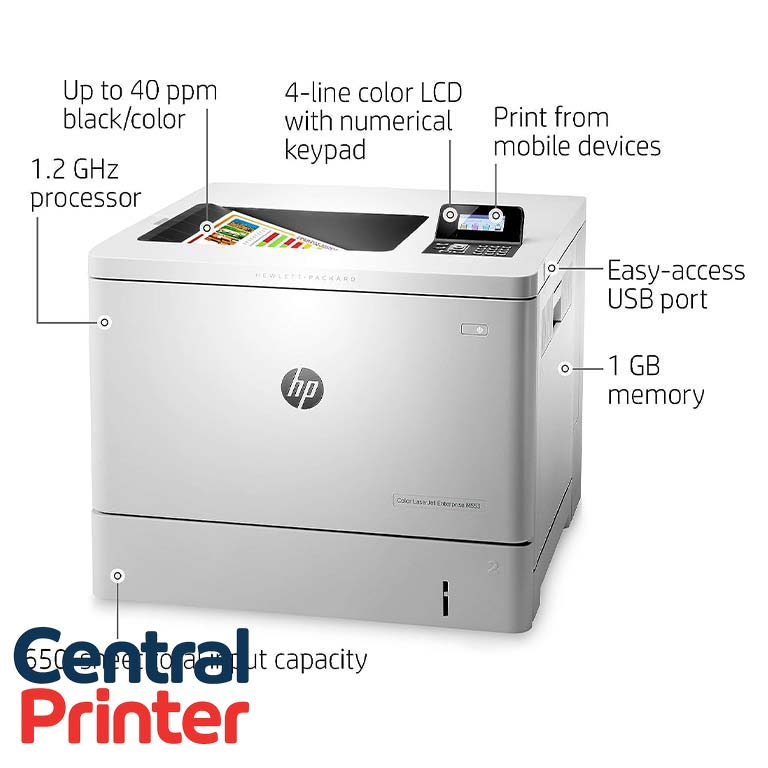 پرینتر لیزری رنگی LaserJet Enterprise M553n شرکت اچ پی با مجهز شدن به سینی 550 برگی و چاپ در ابعاد A4 برای مصارف اداری و .. با حجم کاری زیاد گزینه مناسبی است. این پرینتر ازنظر کیفیت و سرعت چاپ در مقایسه با همردههای خود در سطح بالایی قرار دارد؛ این پرینتر به رزولوشن چاپ 1200 × 1200 مجهز شده و میتواند کاتالوگ و بروشورها را با کیفیت بالایی به چاپ برساند؛ البته قابلیت چاپ رنگی پرینترهای لیزری بههیچوجه با پرینترهای جوهرافشان قابلمقایسه نیست. این پرینتر رنگی به یک صفحهنمایش 4 خطی رنگی مجهز شده است که کاربری آسانی را رقمزده تا کاربر بتواند در کسری از ثانیه تنظیمات موردنظر خود را اعمال و به چاپ برساند.